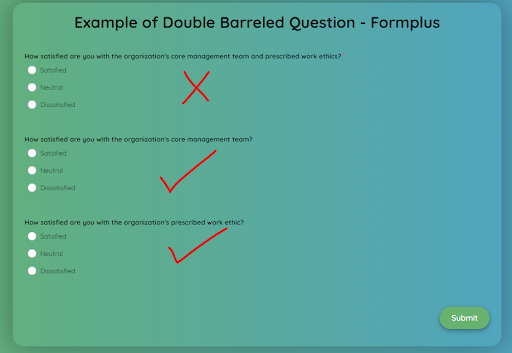 Avoid Double-Barreled Questions questions with multiple parts but the researcher is only looking for one answer. So to get accurate results you need to ask clear questions. If you want to avoid inaccurate results due to poorly phrased questions you should avoid double-barreled questions as well as leading assumptive or confusing questions.